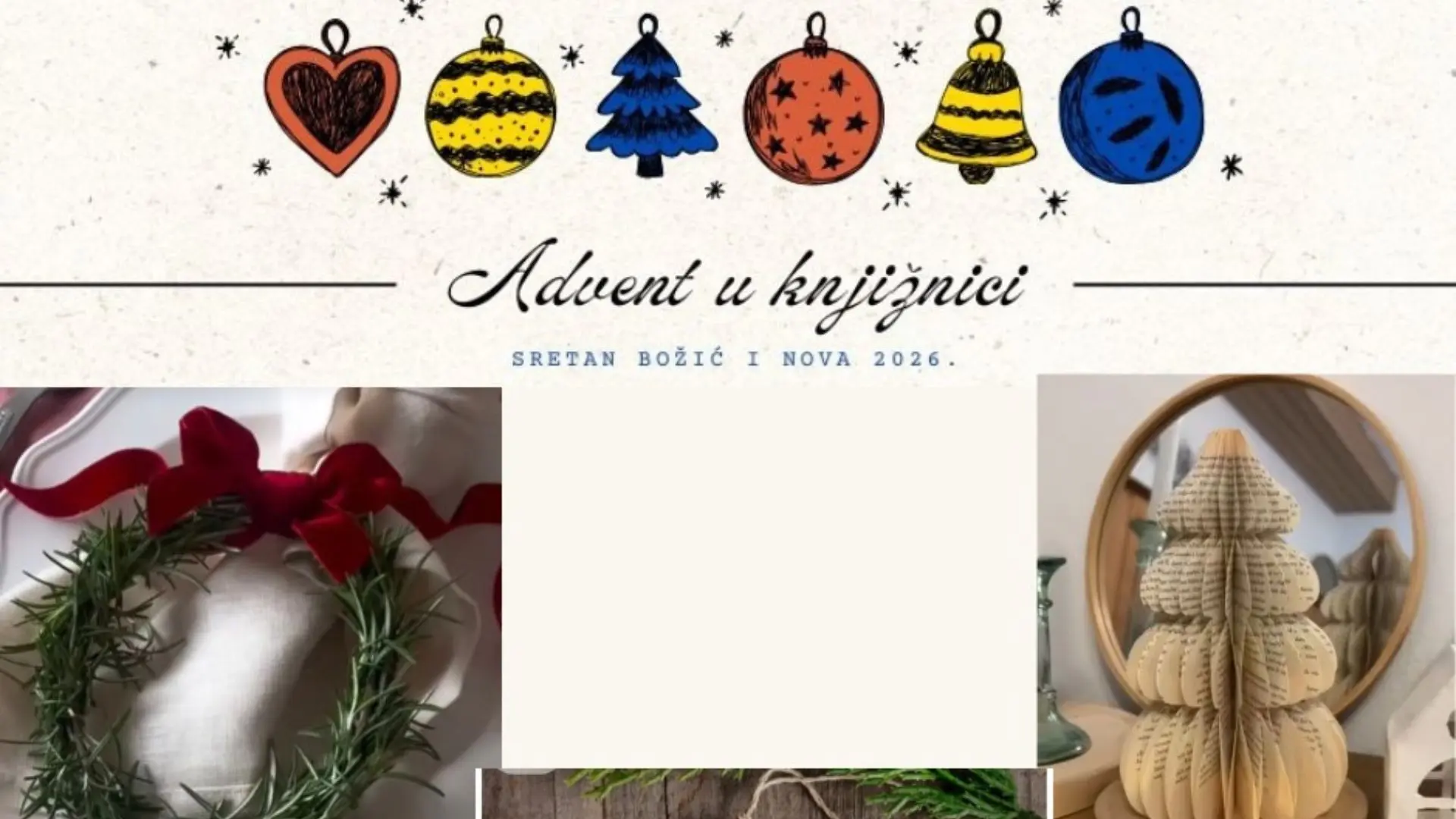 Na radionici ćemo, uz puno mašte i blagdanskog raspoloženja, izrađivati božićne ukrase od prirodnih materijala i starih knjiga – mirisne vjenčiće od ružmarina, anđele i božićna drvca izrađena od preklopljenih stranica knjiga.
