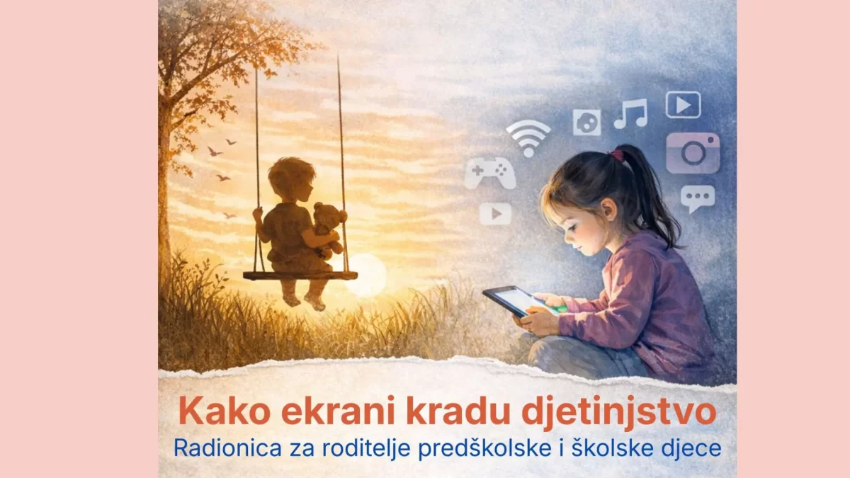 Pozivamo vas na još jednu radionicu o opasnostima ekrana. Ove smo joj godine odlučile dati naziv Kako ekrani kradu djetinjstvo. Poslušajmo stručnjake i razgovarajmo jer naša je odgovornost odgojiti zdravu i odgovornu djecu koja će jednog dana biti aktivni sudionici društva.
